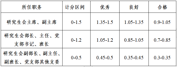 a)担任干部时间至少1年;担任多项职务者取最高分,不重复加分;学生干部加分须提交当年度个人工作业绩总结材料(含电子稿)1份。