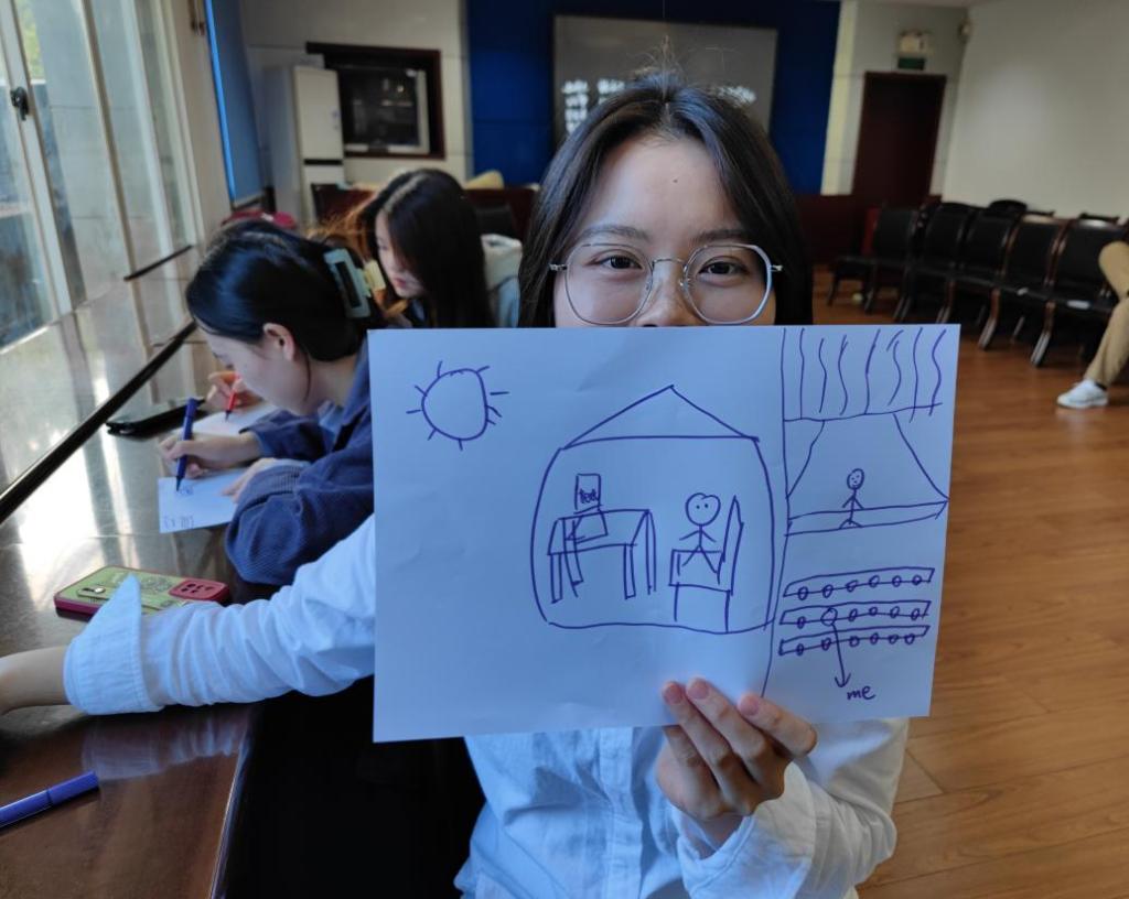 在“团队展示”这一环节中,每支团队在短时间内设计出队伍Logo、队名和标语,并上台进行展示;在“个人展示”中,同学们通过绘画的方式描绘出自己当下的状态以及对未来的憧憬。