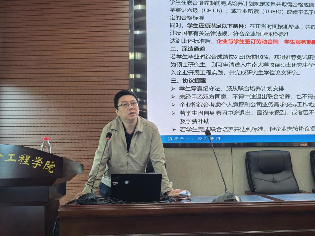 4月22日下午15时,紫金国际采矿工程师班宣讲会在岳麓山校区采矿楼T302顺利举办。紫金(长沙)工程技术有限公司副总经理仵锋锋、静县备战矿业有限责任公司副总经理牟延波、紫金矿业集团人力资源部人才发展中心主任林晞、学院副院长黄锐、辅导员于谦、王子涵、黄佳星以及本科2025级采矿工程专业全体学生参加本次宣讲。