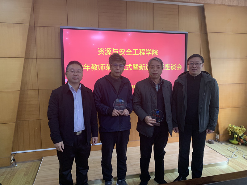 2019年退休教师荣休暨新进教师座谈会在采矿楼222举行。两位退休教师、8位新进青年教师以及学院领导欧旭理、罗周全、马国荣、李孜军、邓红卫出席此次座谈会。会议由罗周全院长主持。