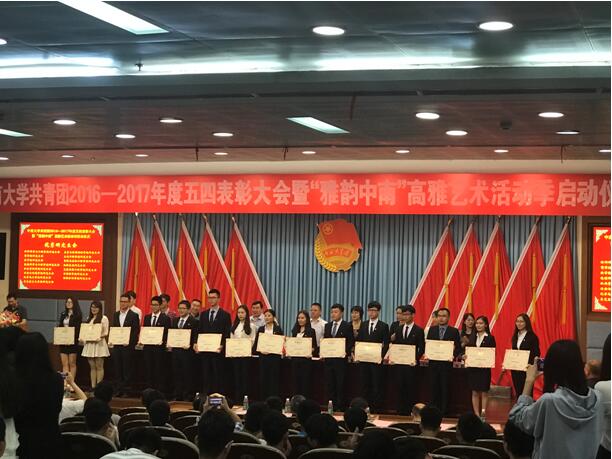 委员会举办了2016-2017年度五四表彰大会暨“雅韵中南”高雅艺术活动季启动仪式,我院荣获了“五四红旗团委标兵”、“优秀研究生会”、“优秀学生会”、“‘青春向学’学风建设先进集体”、“新媒体工作奖”等荣誉称号。