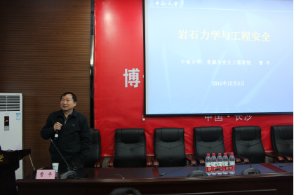 副院长曹平教授应邀作了《岩石力学与工程安全》的学术报告。曹平教授的报告,系统阐述了岩石的强度、岩石的脆性破坏、岩石的大变形破坏、岩石的水作用,与基于工程安全的岩石力学判据间的关系,并表示从事岩石力学实验时,应该慎思笃行,实事求是,严密科学。