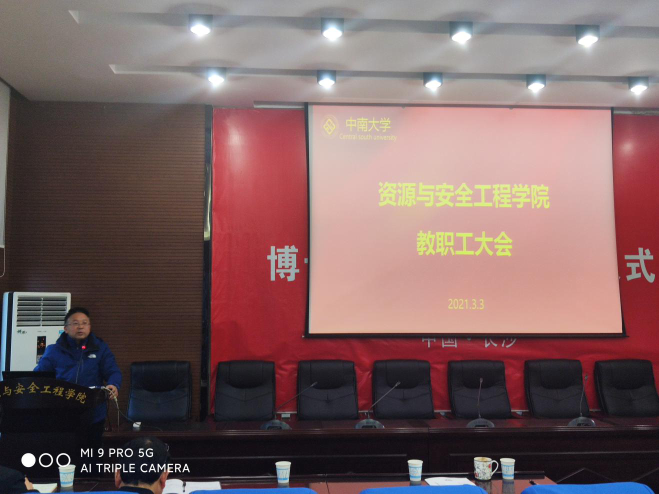 在采矿楼302召开全院教职工大会。院党委书记欧旭理等全体院领导及教职工参加了会议,会议由主持学院行政工作的周子龙副院长主持。