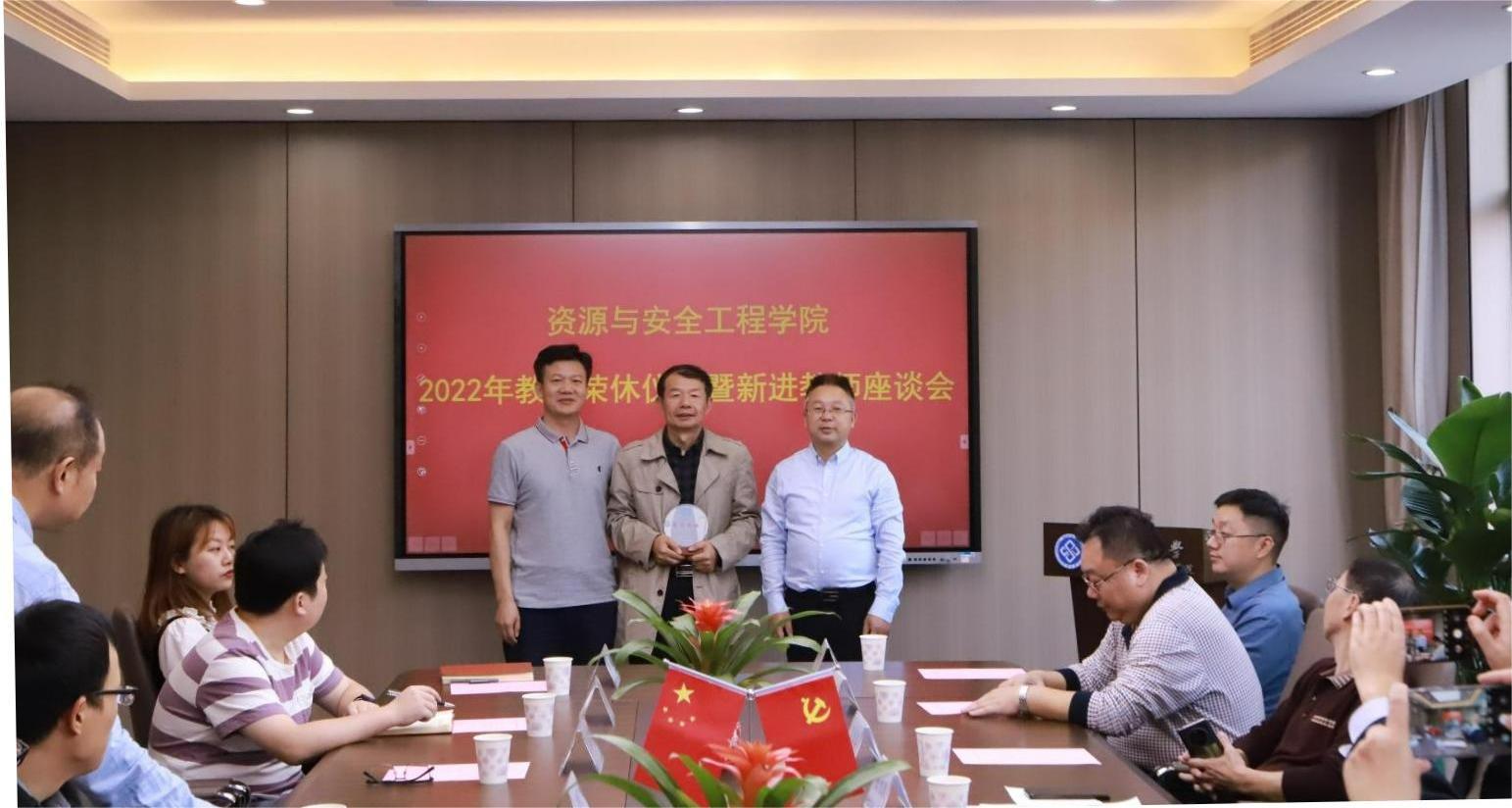 于采矿楼222会议室举行教师荣休仪式暨新进教师座谈会,学院领导班子、2021年以来退休教师以及新进教师参与本次座谈会。此次座谈会由学院党委书记欧旭理主持。