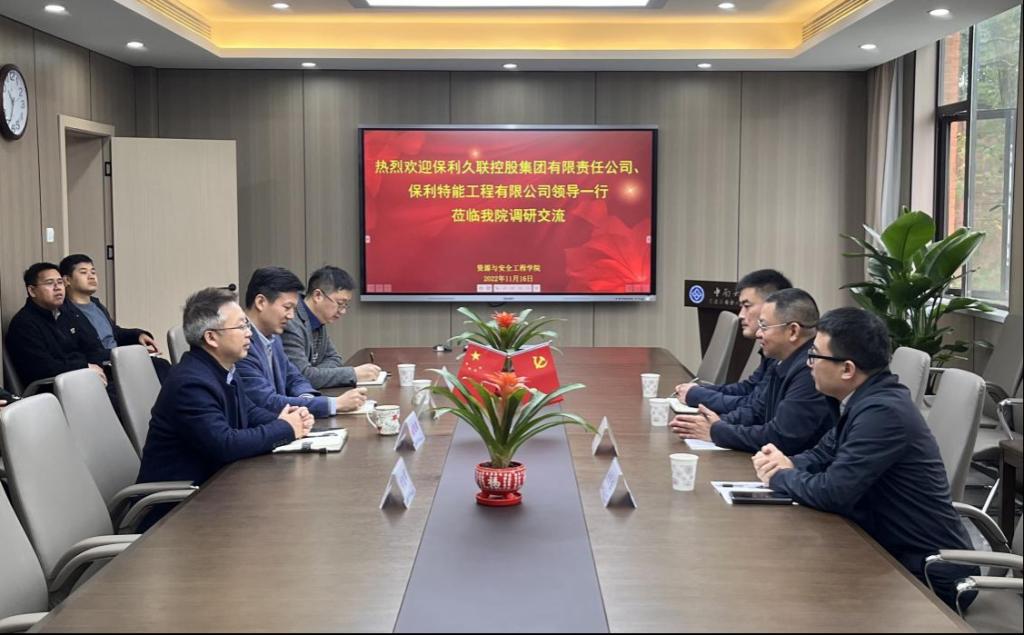 对保利久联集团领导一行的来访表示欢迎,并向企业领导介绍了学院的发展历史、学科专业情况、师资人才队伍情况以及主要亮点研究方向。随后周院长为领导们展示了学院重大研究成果以及当前学院科研优势。保利特能工程有限公司党委书记、董事长胡浩川对学院的热情接待表示感谢,双方就矿山绿色开采与固废资源化利用、智能化爆破技术与装备、全生命周期评价与生态安全、岩体灾害智能感知与综合防控等方面展开了交流和讨论。