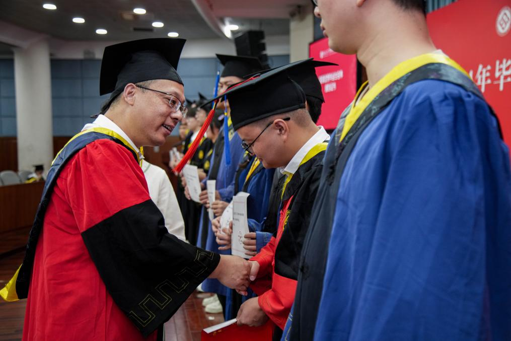 典礼结束后,学位授予仪式正式开始。毕业生们身着学位服有序上台,依次接受学位授予。学院老师们为获得学位的毕业生正冠拨穗,握手道贺,并共持学位证书合影留念。